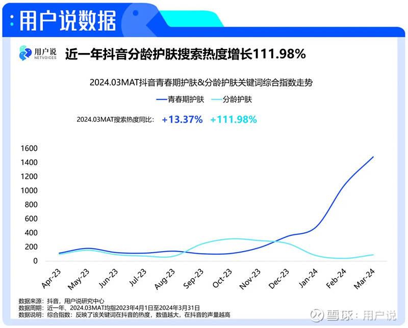 抖音、小红书等社交媒体上关于分龄护肤、青春期护肤的话题呈现较高的关注度,据用户说数据监测,2024年3月MAT抖音“青春期护肤”一词搜索热度同比增长13.37%