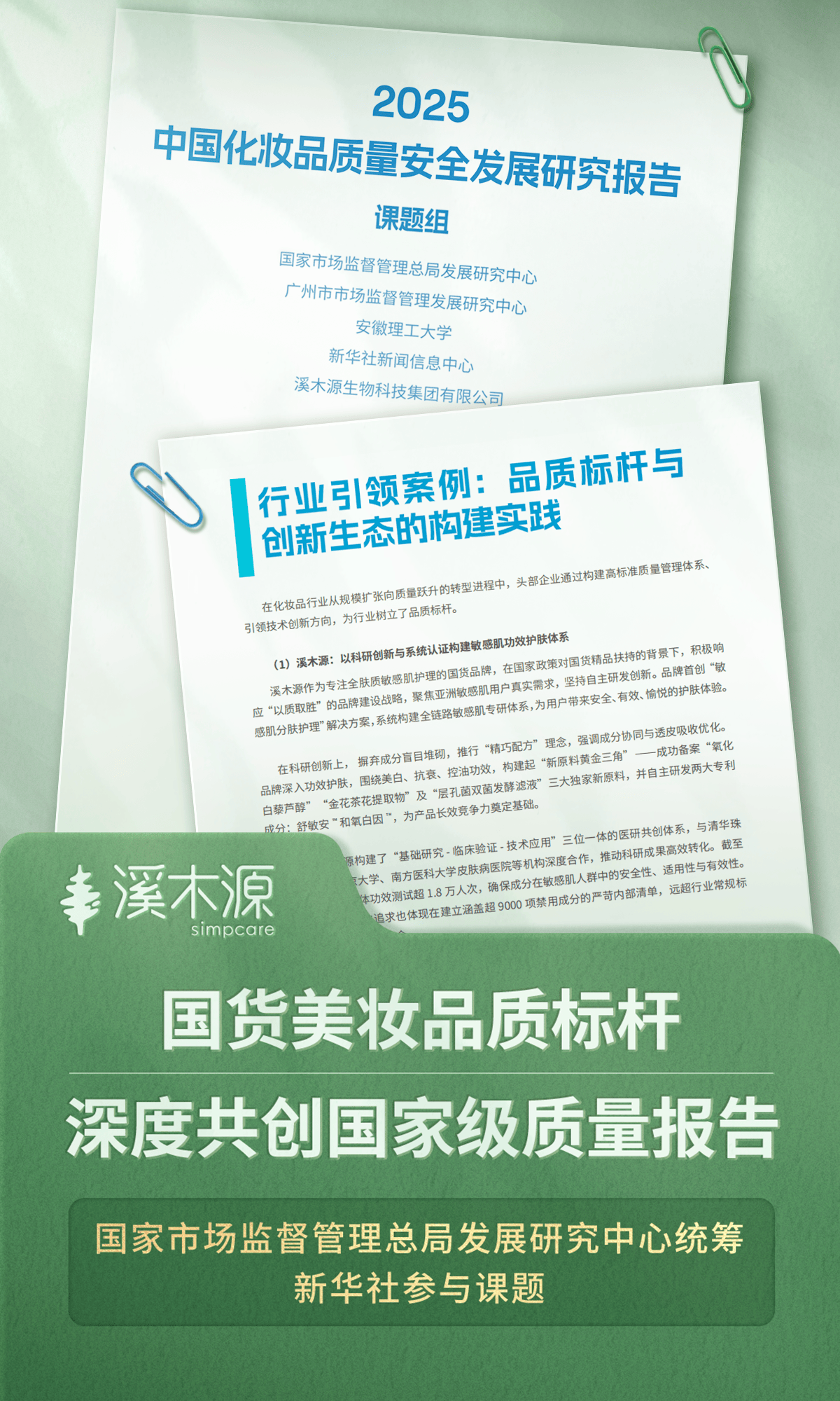 作者:CMD368 日期:2026-02-12 浏览: 来源:CMD368体育近日,国家市场监管总局发展研究中心在京召开化妆品行业高质量发展研讨会,正式发布《2025中国化妆品质量安全发展研究报告》。报告指出,中国化妆品产业正经历从“规模扩张”向“质量引领”的深刻转型,国货品牌市场份额持续提升,行业质量安全态势总体平稳向好。作为专注敏感肌护理的国货美妆品牌,溪木源深度参与了报告的研讨与共创工作,与安徽理工大学、新华社及多家美妆企业共同组成课题组。其以科研创新和严苛品控为核心的发展路径,为报告提供了具有行业引领意义的实践案例。