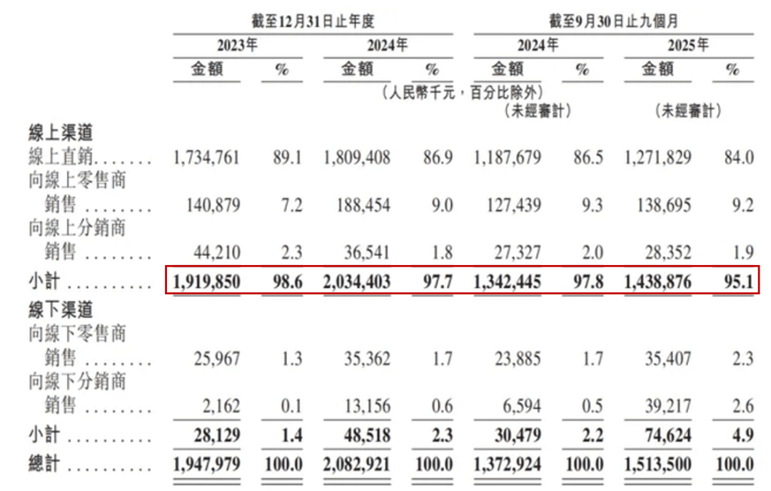 而更值得关注的是其近乎“全线上化”的渠道结构,在过去三年间,HBN线上直销及向线上零售商的销售收入占比始终高于95%,2025年前三季度线亿元。