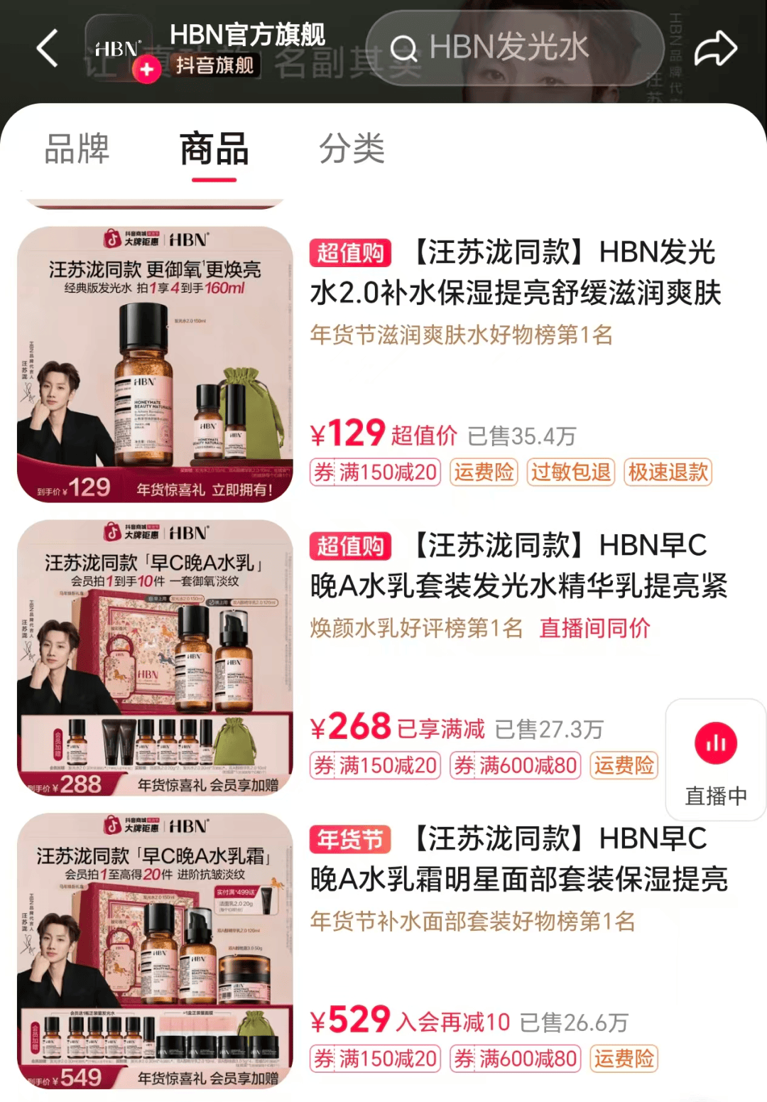 抖音渠道的产品策略与传统电商形成互补,核心单品仍聚焦发光水、视黄醇系列等优势品类,却更侧重组合套餐销售,更贴合直播场景下用户对“高性价比组合”的需求。