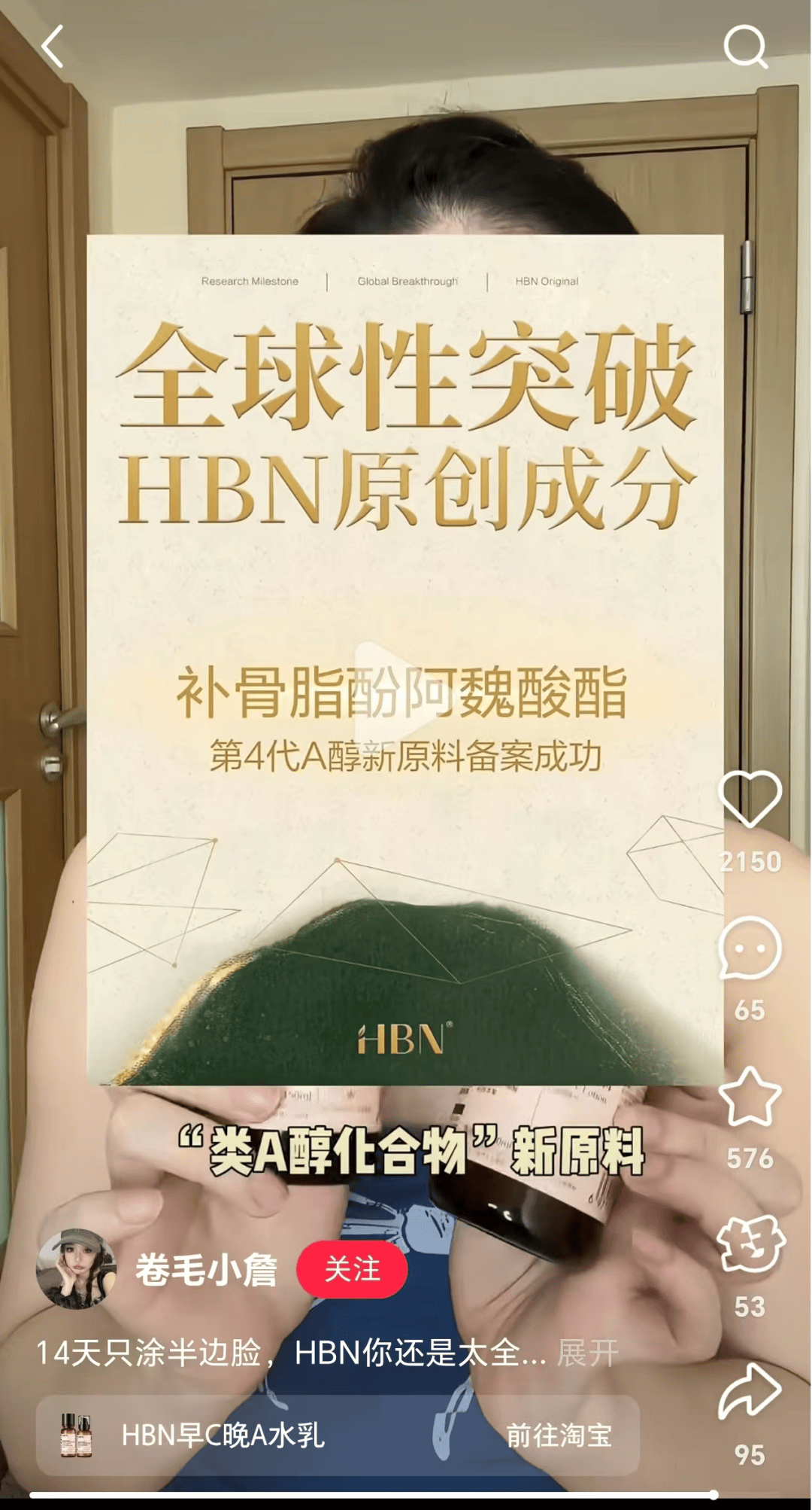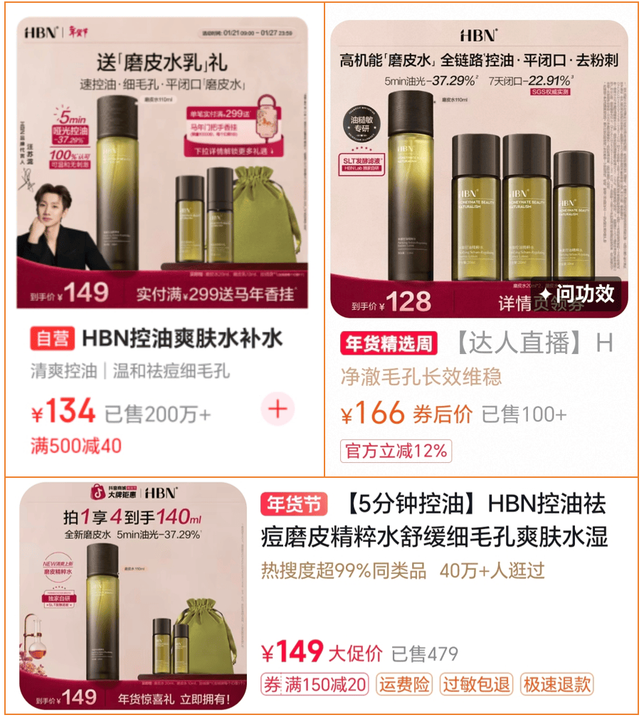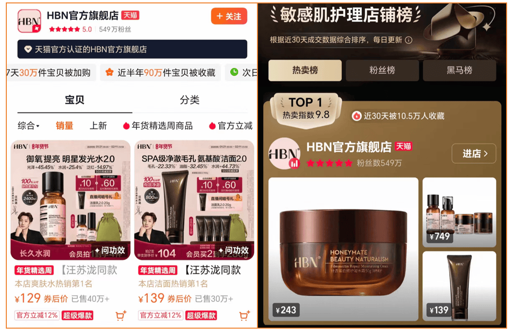 HBN在淘宝渠道以功效型精华水、A醇抗老系列为核心发力点,精准契合货架电商用户主动搜索功效性产品的消费习惯。